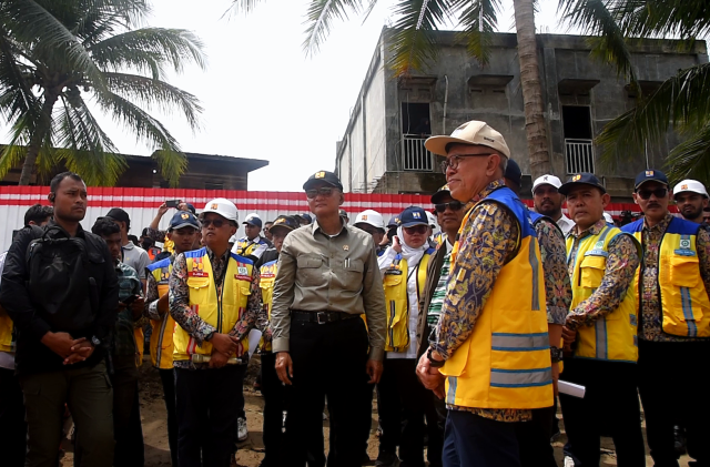 Usai rangkaian pertemuan, Menteri PU bersama rombongan meninjau langsung proses pemancangan tiang pondasi jembatan. Alat berat terlihat beroperasi di lokasi sebagai tanda dimulainya tahapan konstruksi utama jembatan permanen.