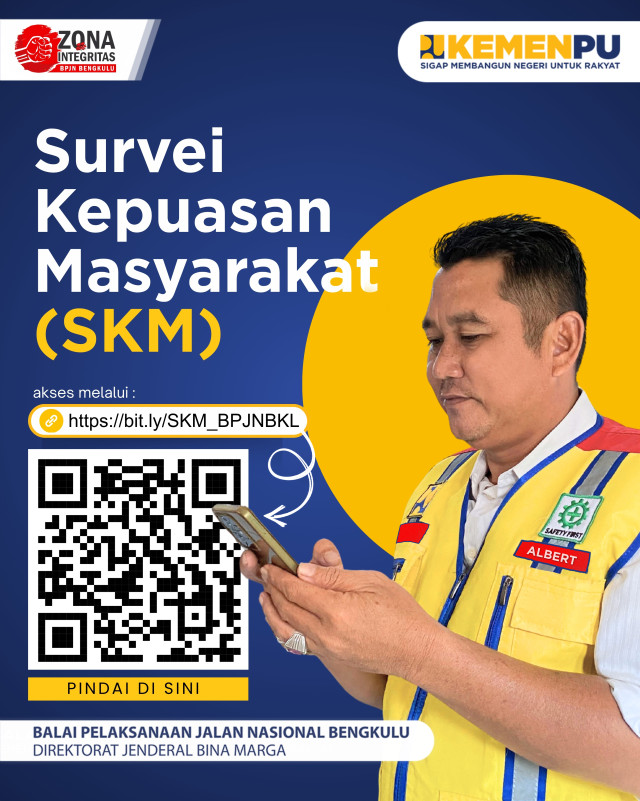 Dalam rangka pembangunan Zona Integritas - Wilayah Birokrasi dan Bersih Melayani (WBBM) dan Meningkatkan Kualitas Pelayanan Publik Kementerian PU, khususnya di Balai Pelaksanaan Jalan Nasional Bengkulu, kami mohon kesediaannya untuk memberikan umpan balik melalui pengisian Kuesioner Survei Kepuasan Masyarakat (SKM) Semester II Tahun 2025. Saran dan masukan Bapak/Ibu sangat berarti bagi kami. Data dan informasi yang Bapak/Ibu berikan hanya dipergunakan untuk kepentingan surveI dan dilindungi kerahasiannya.