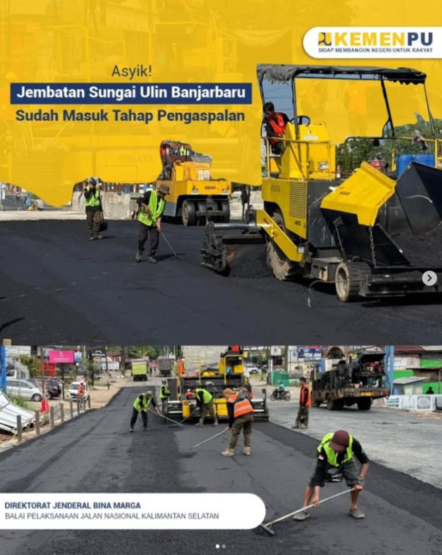 Pekerjaan penggantian Jembatan Sungai Ulin di Jalan Ahmad Yani Km 31 kini memasuki tahap pengaspalan yang telah dilaksanakan pada Minggu (28/09/2025) dan Senin (29/09/2025) oleh tim PPK 2.1 Prov. Kalsel.