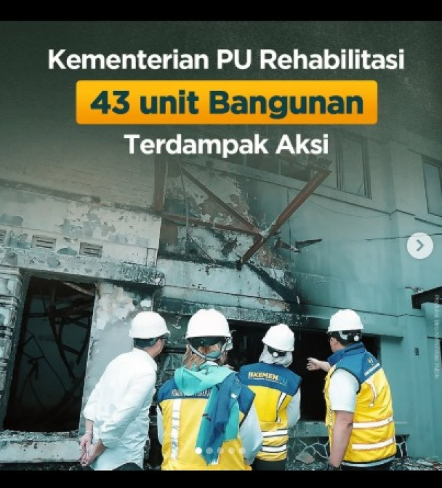 Kementerian PU langsung bergerak merehabilitasi 43 unit bangunan dan gedung di 6 provinsi dan 15 kota/kabupaten yang terdampak aksi penyampaian aspirasi masyarakat akhir Agustus 2025. Rehabilitasi dibagi berdasarkan klasifikasi kerusakan ringan, sedang, hingga berat, untuk menentukan langkah rehabilitasi dalam mengembalikan fungsi bangunan.