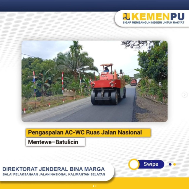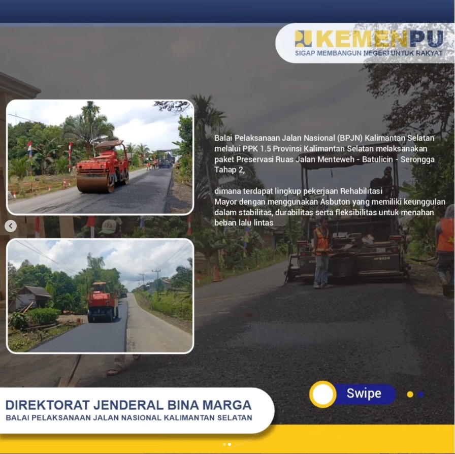 Balai Pelaksanaan Jalan Nasional (BPJN) Kalimantan Selatan melalui PPK 1.5 Provinsi Kalimantan Selatan melaksanakan paket Preservasi Ruas Jalan Menteweh - Batulicin - Serongga Tahap 2, dimana terdapat lingkup pekerjaan Rehabilitasi Mayor dengan menggunakan Asbuton yang memiliki keunggulan dalam stabilitas, durabilitas serta fleksibilitas untuk menahan beban lalu lintas