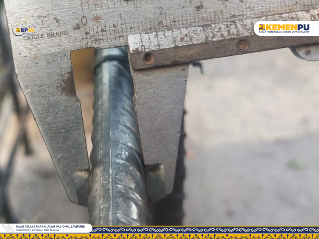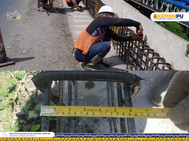 Pemeliharaan berkala jembatan yang dilaksanakan meliputi penggantian sandaran beton yang menggunakan tulangan utama besi D16-150 dan tulangan pembagi dengan besi D13-150. Pelaksanaan pembesian pada pekerjaan penggantian sandaran beton Jembatan Way Galih telah sesuai gambar kerja dan spesifikasi, serta telah dilakukan pengujian mutu oleh lembaga independen dan Tim Unit Kepatuhan Internal (UKI) BPJN Lampung berdasarkan prinsip keselamatan konstruksi dan diawasi secara berkelanjutan.