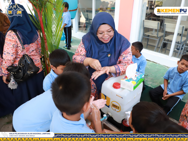Anak-anak juga mendapatkan pengalaman praktik Cuci Tangan Pakai Sabun (CTPS) yang dipandu langsung oleh ibu-ibu DWP BPJN Lampung. Lewat praktik ini, siswa memahami langkah mencuci tangan yang baik dan benar sebagai upaya menjaga kesehatan sehari-hari.