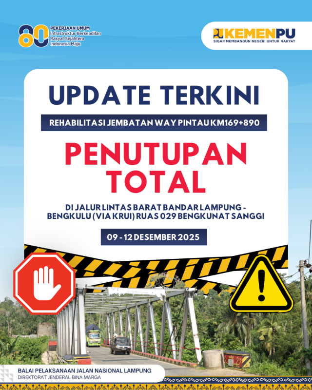 Akan dilakukan penutupan arus lalulintas secara total pada Selasa, 09 Desember 2025 sampai dengan Jumat, 12 Desember 2025 pada Lintas Barat Bandar Lampung - Bengkulu (Via Krui) Ruas 029 Bengkunat Sanggi.