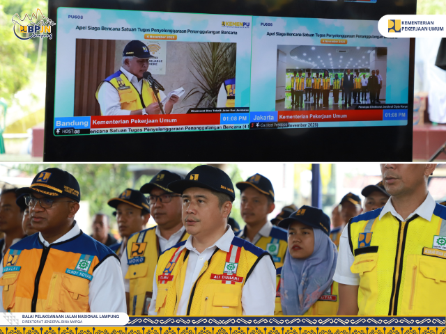 Bandar Lampung, 04 November 2025 — Balai Pelaksanaan Jalan Nasional (BPJN) Lampung bersama UPT Kementerian Pekerjaan Umum Provinsi Lampung serta para stakeholder terkait mengikuti Apel Siaga Bencana Satuan Tugas Penyelenggaraan Penanggulangan Bencana yang digelar secara hybrid oleh Kementerian Pekerjaan Umum (KemenPU).