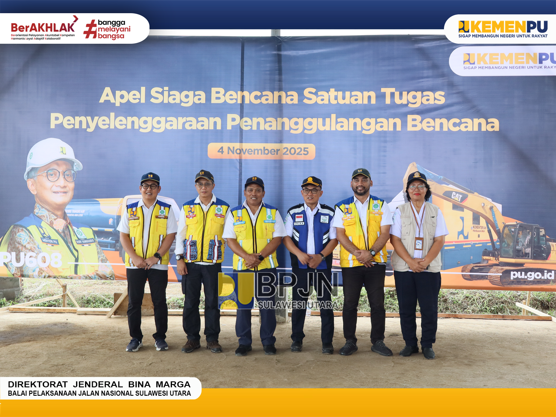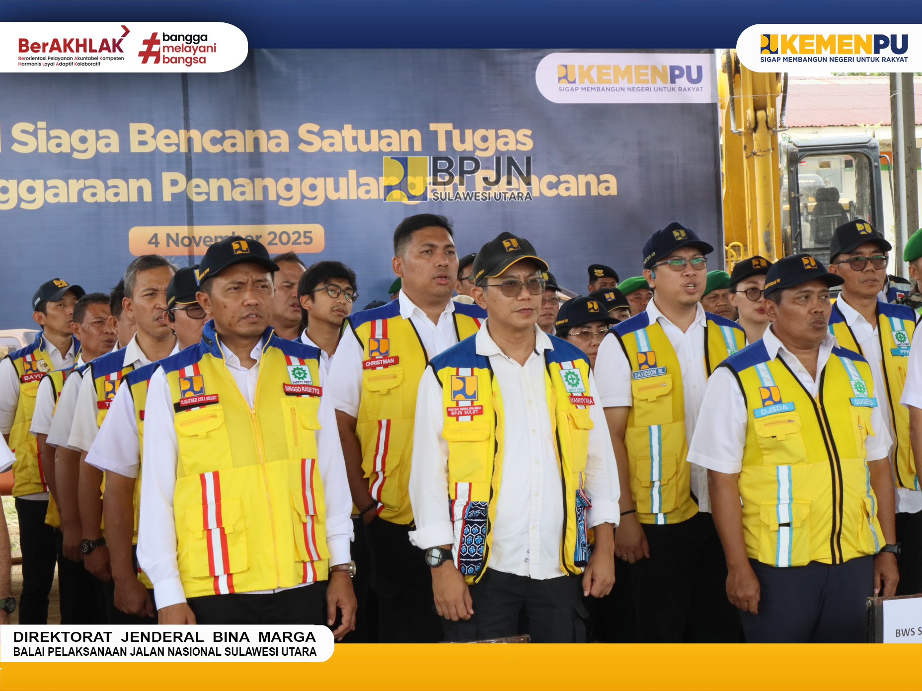 Selasa, (04/11/2025). Unit Pelaksana Teknis (UPT) Kementerian Pekerjaan Umum (PU) Provinsi Sulawesi Utara mengikuti kegiatan Apel Siaga Bencana, sebagai bentuk antisipasi dampak perubahan musim sesuai dengan prakiraan daerah potensi bencana hidrometeorologi ekstrem basah khususnya puncak musim penghujan di bulan November 2025 hingga bulan Februari 2026 dan kesiapan jelang Natal dan Tahun Baru (Nataru).