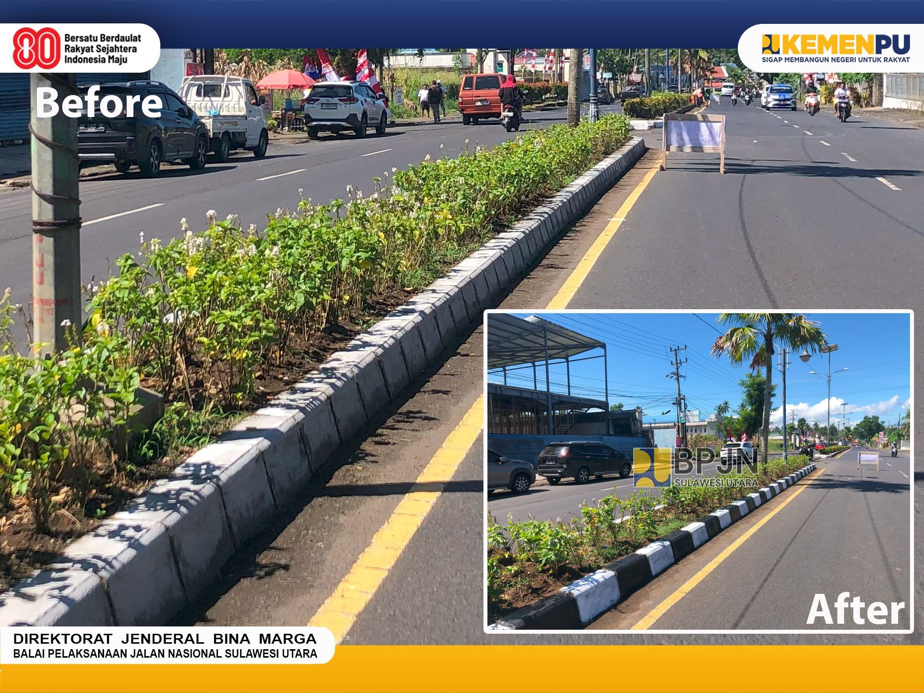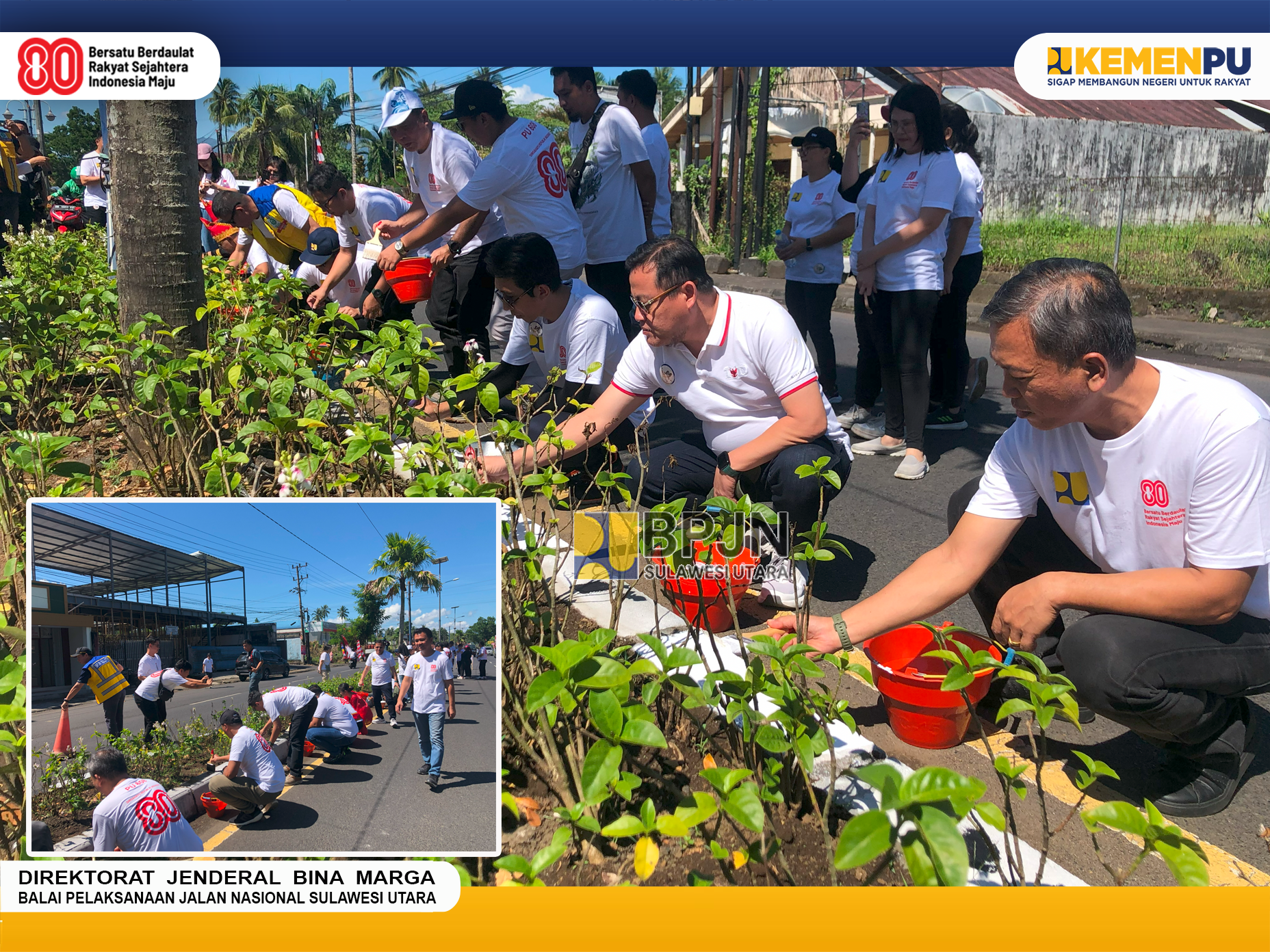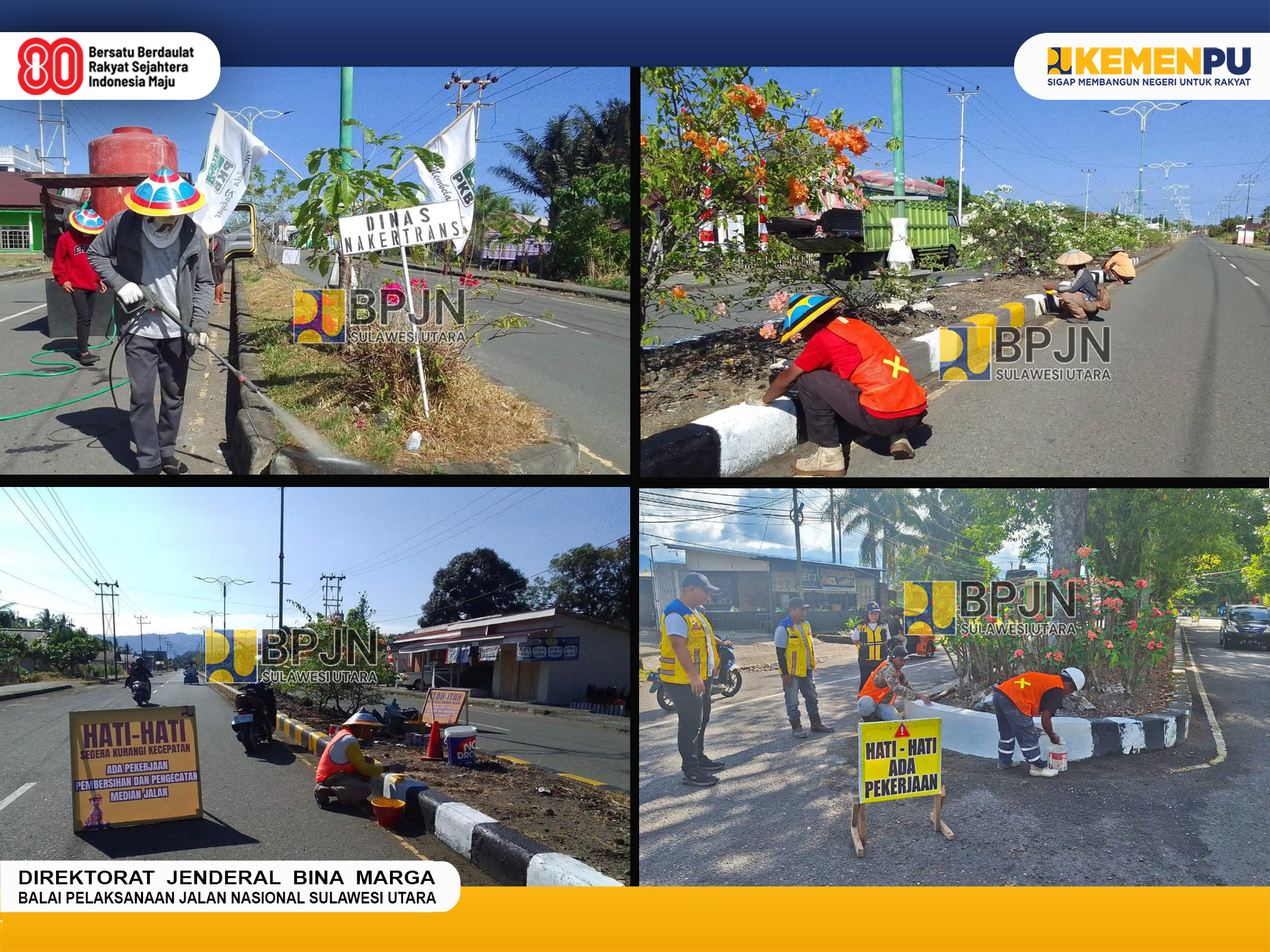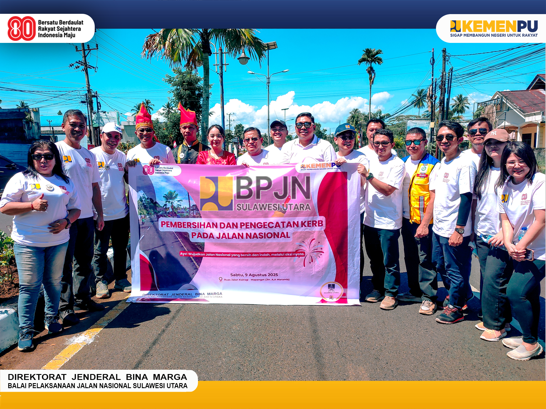 Dalam rangka memperingati Hari Ulang Tahun Republik Indonesia ke-80, Balai Pelaksanaan Jalan Nasional (BPJN) Sulawesi Utara melaksanakan Kegiatan Pembersihan dan Pengecatan Kerb pada Ruas Jalan Nasional. Kegiatan ini dilaksanakan serentak oleh seluruh Balai dilingkungan Direktorat Jenderal Bina Marga, Kementerian Pekerjaan Umum. Sabtu (09/08/2025).