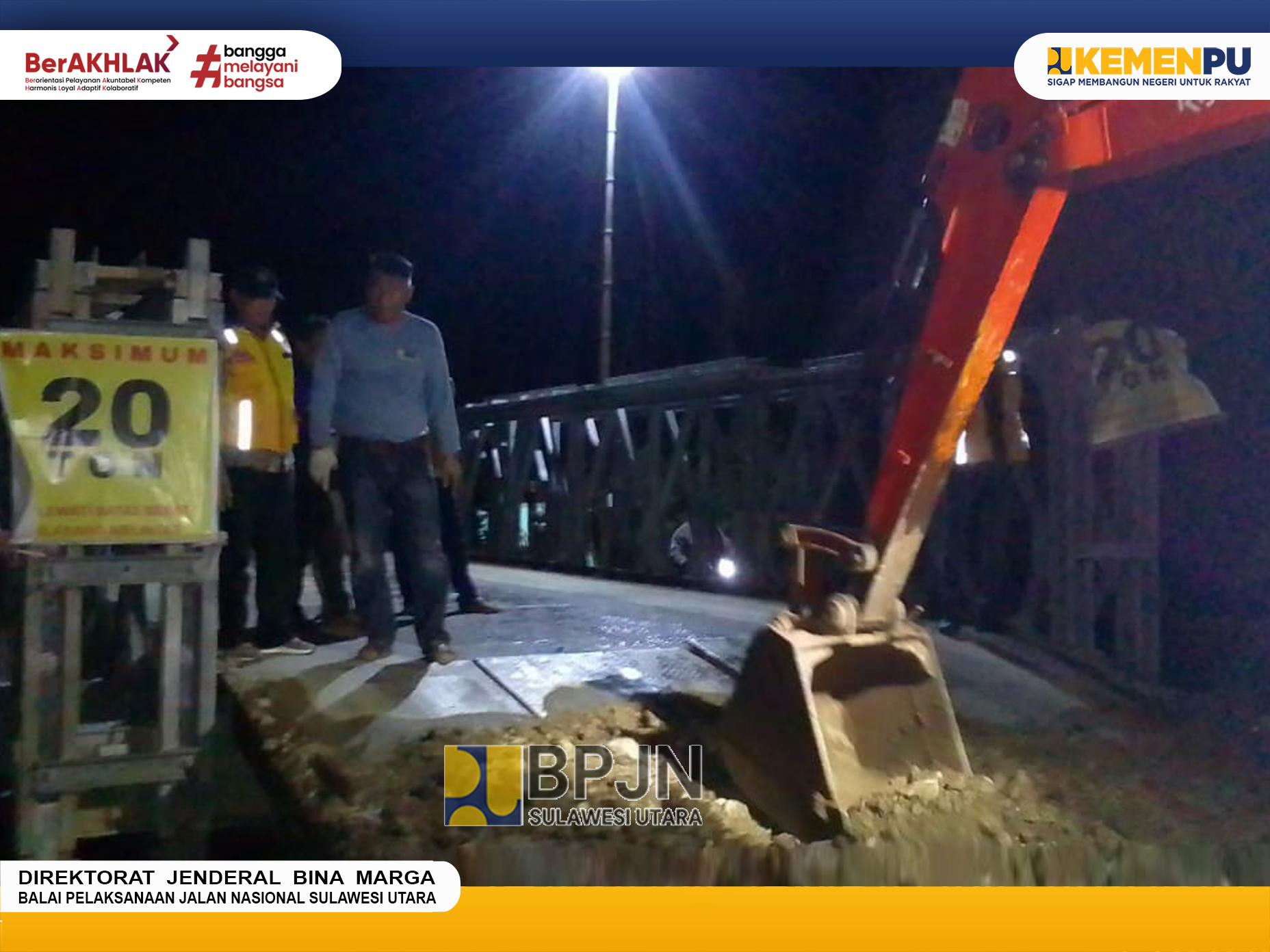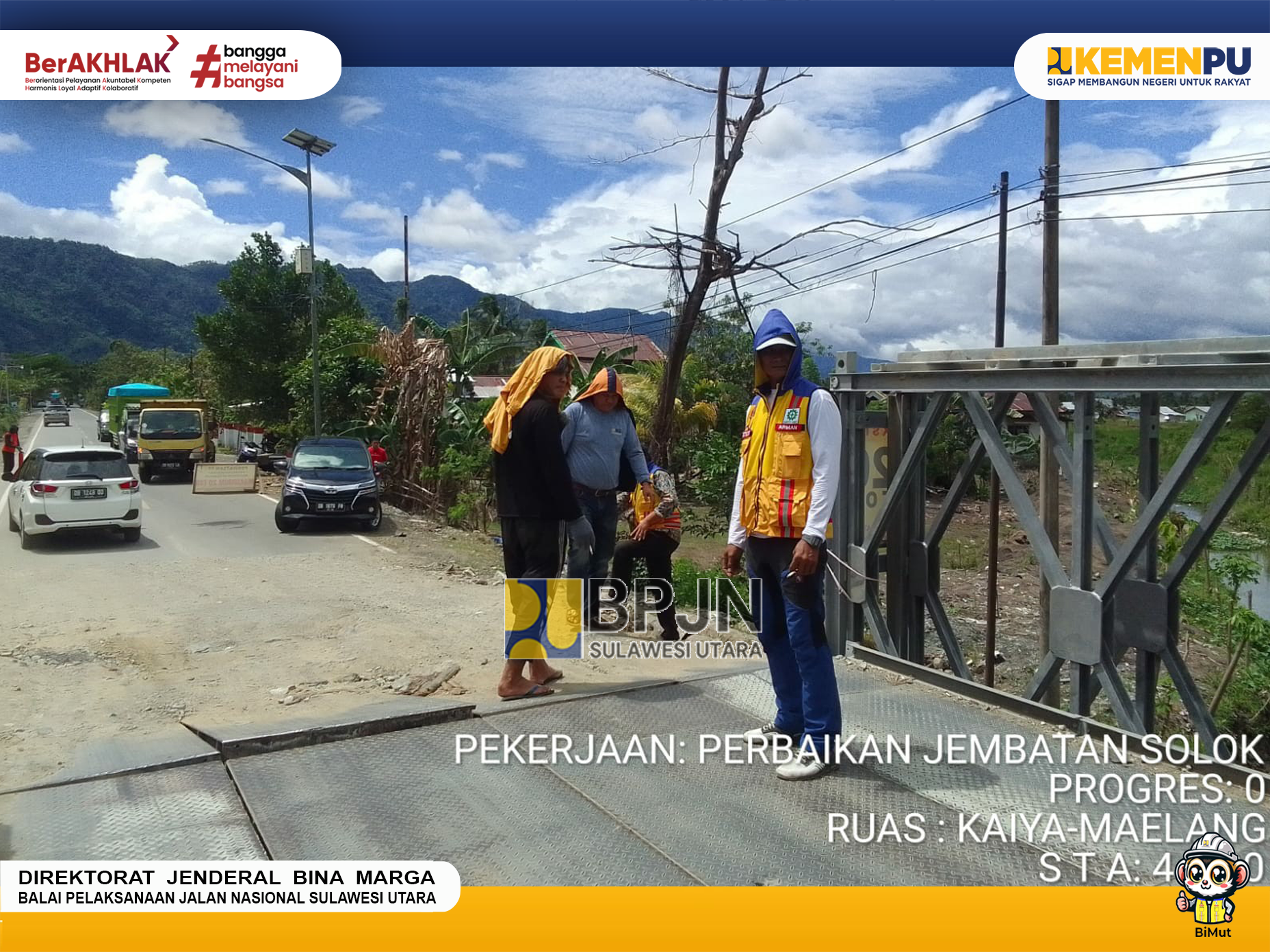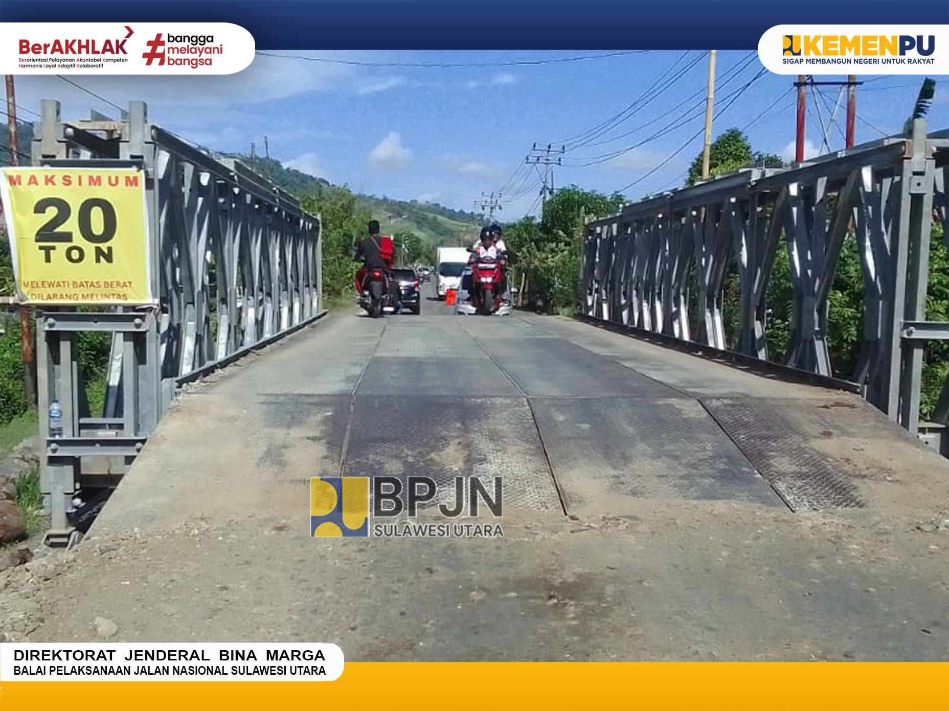 Balai Pelaksanaan Jalan Nasional (BPJN) Sulawesi Utara, Melalui Pejabat Pembuat Komitmen (PPK) 2.1, PJN Wilayah II Prov Sulawesi Utara telah melakukan penanganan dan perbaikan pada Jembatan Darurat (Bailey) yang terpasang di Ruas Jalan Nasional Trans Sulawesi, tepatnya di Desa Solog, Kecamatan Lolak, Kabupaten Bolaang Mongondow.