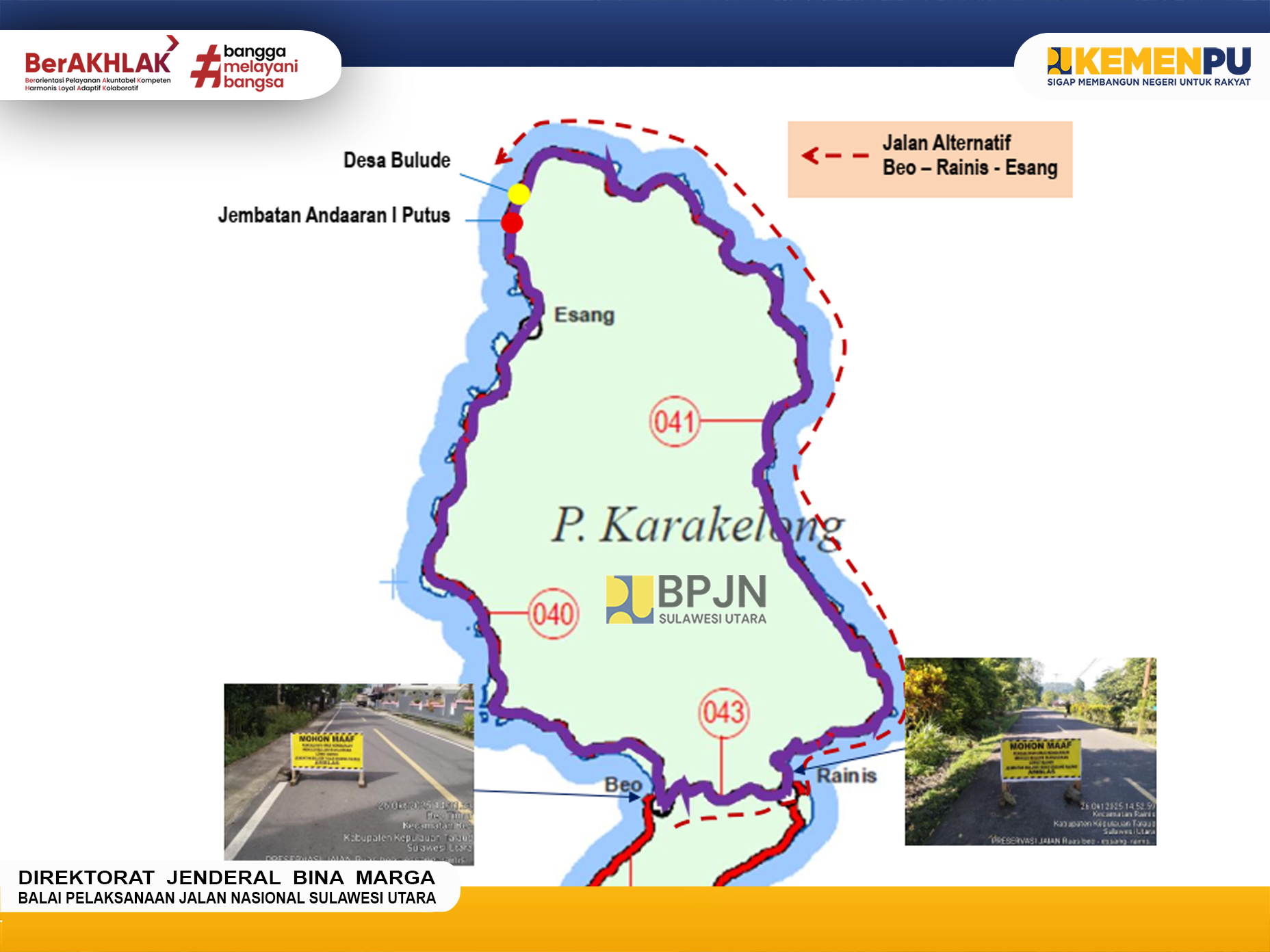 Balai Pelaksanaan Jalan Nasional (BPJN) Sulawesi Utara, Melalui Satuan Kerja Pelaksanaan Jalan Nasional Wilayah III, PPK 3.3 Provinsi Sulawesi Utara melakukan penanganan darurat Amblasnya Jembatan Andaaran I di Ruas Jalan Nasional Beo - Esang dan Esang - Rainis menuju Desa Bulude dan Desa Mamahan, kecamatan Esang, Kabupaten Kepulauan Talaud, pada Sabtu (25/10/2025).