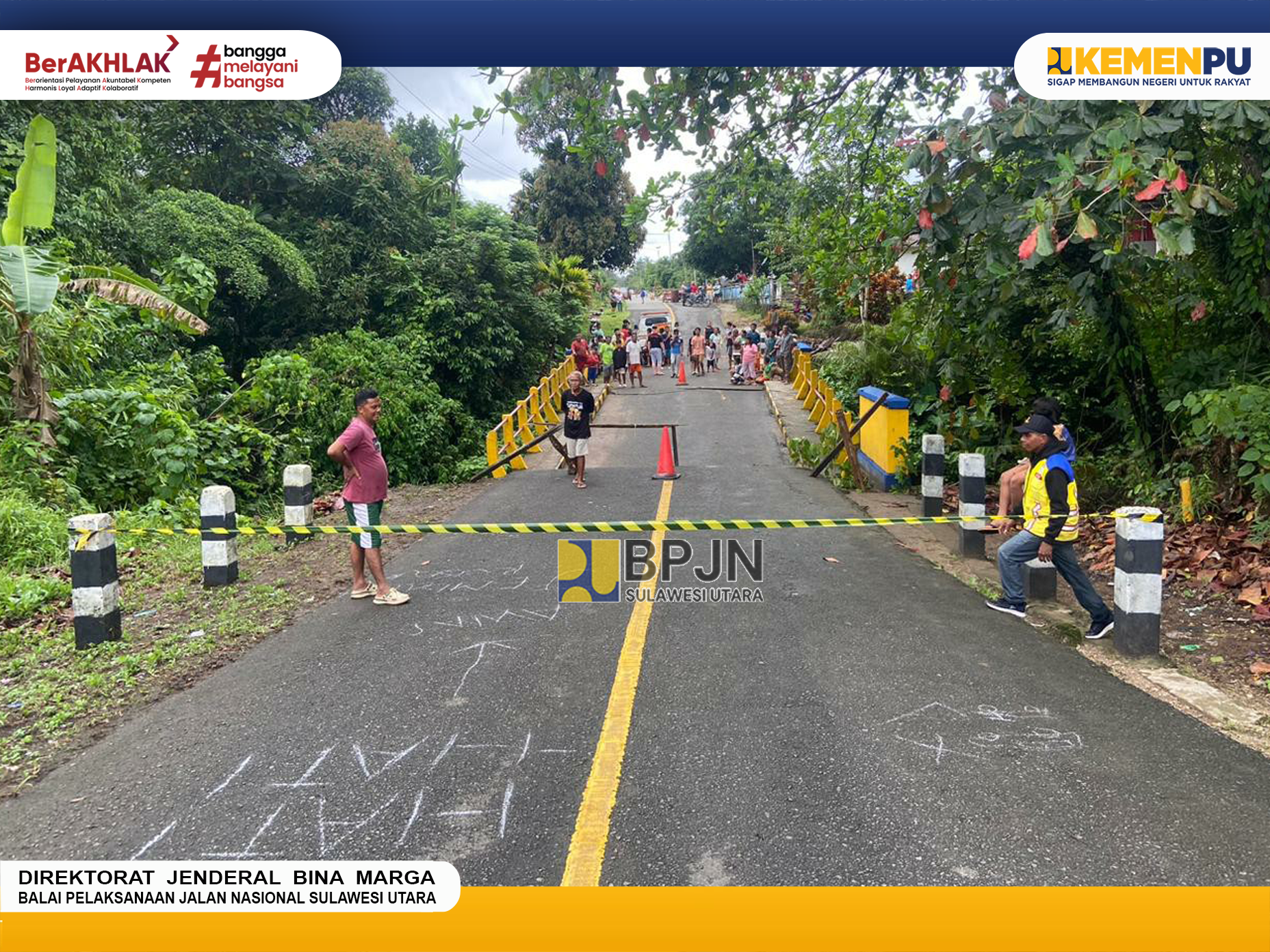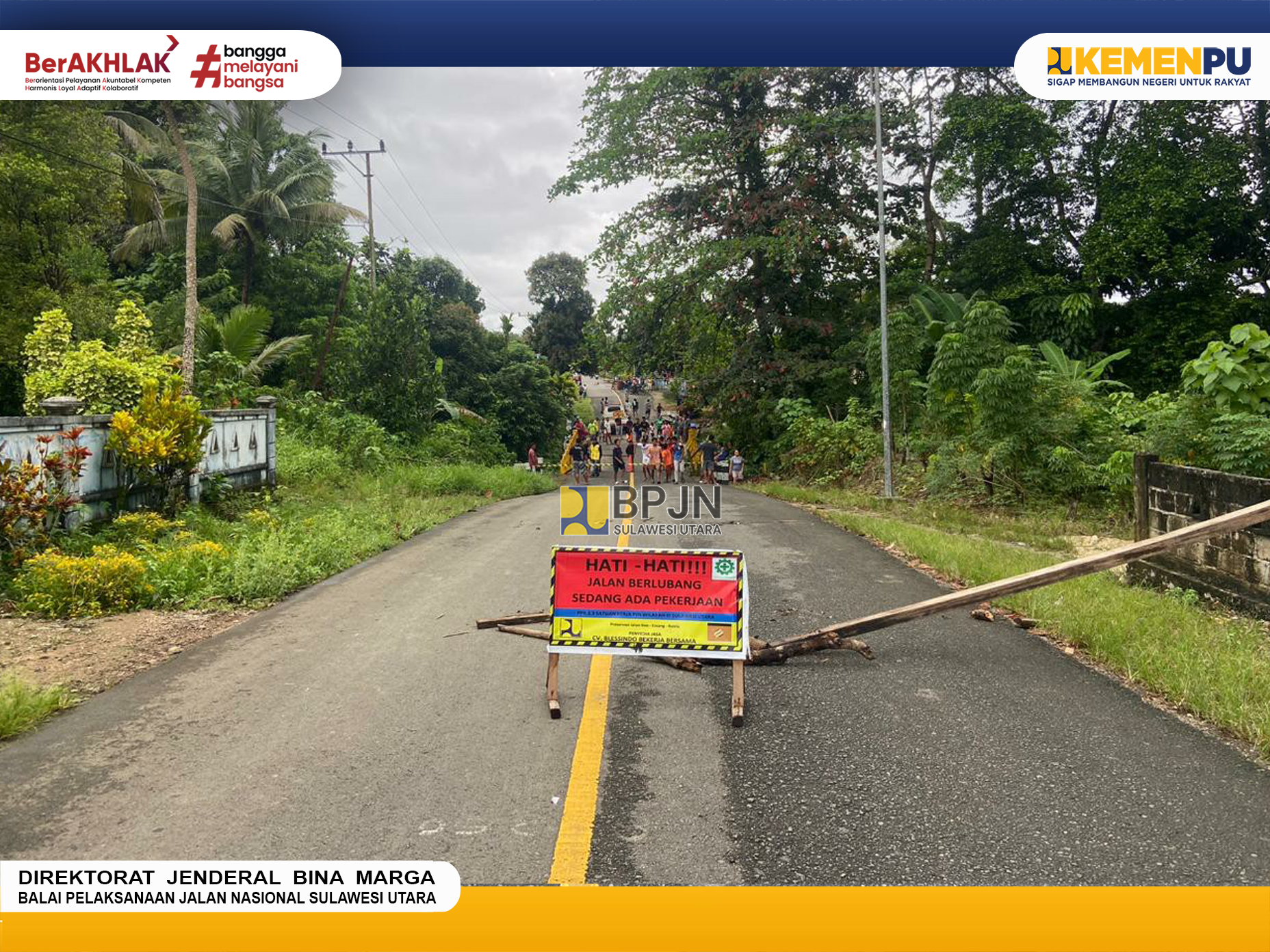 PPK 3.3 Satuan Kerja Pelaksanaan Jalan Nasional Wil. III Provinsi Sulut (Sangihe Talaud) telah melakukan penanganan darurat berupa Penutupan Total akses jalan menuju jembatan dengan melakukan pemasangan rambu dan safety line agar tidak ada pengguna jalan yang melintas.