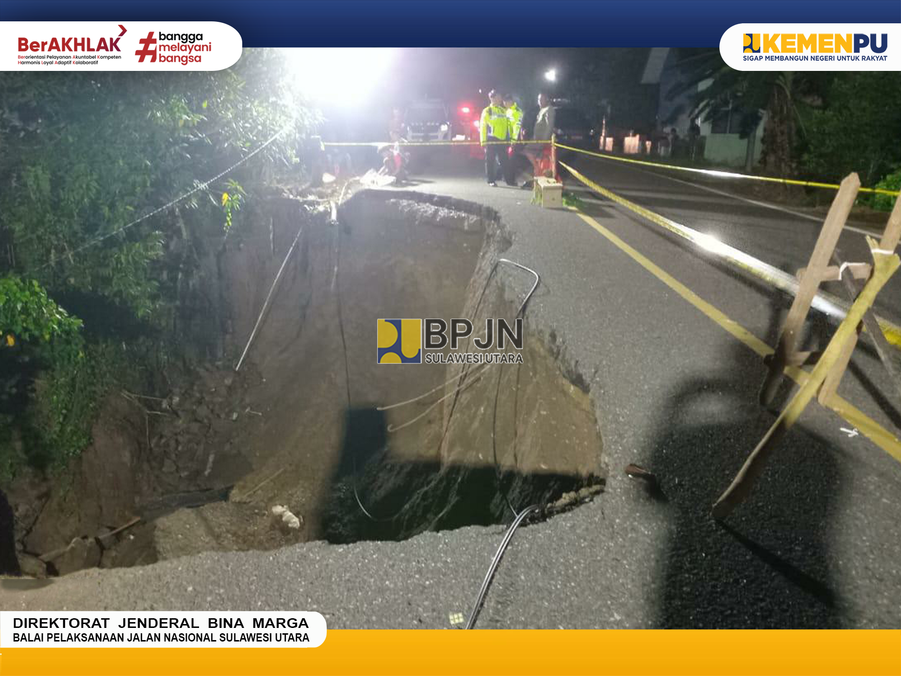 BPJN Sulut melalui PPK 2.4 Satker PJN Wil. II Prov. Sulawesi Utara bersama aparat terkait telah melakukan upaya Penanganan darurat sementara dengan memasangan rambu peringatan, dan menerapkan sistem buka tutup (contraflow) pada salah satu jalur yang masih bisa dilewati kendaraan.