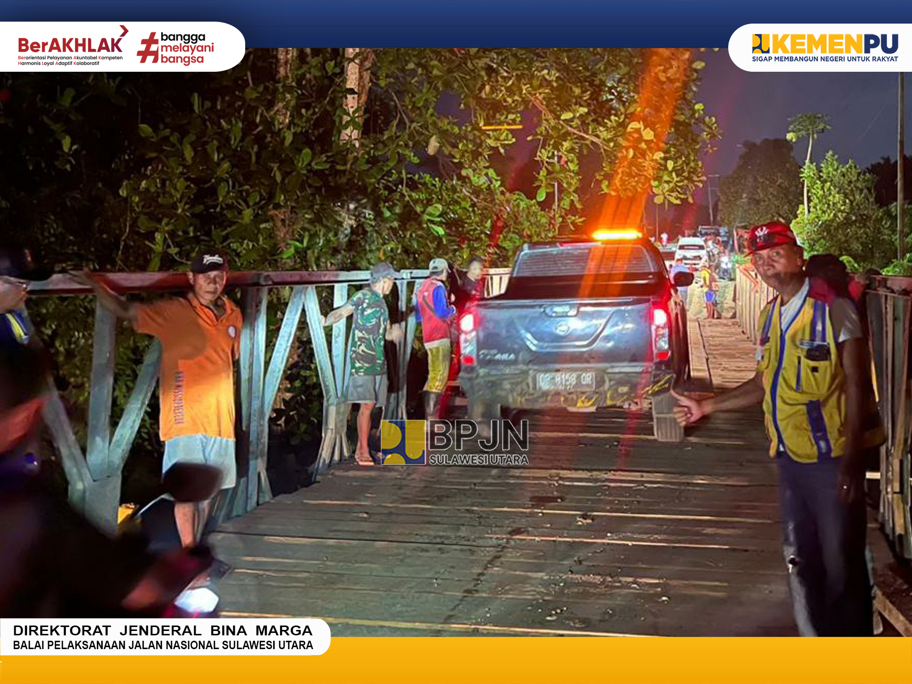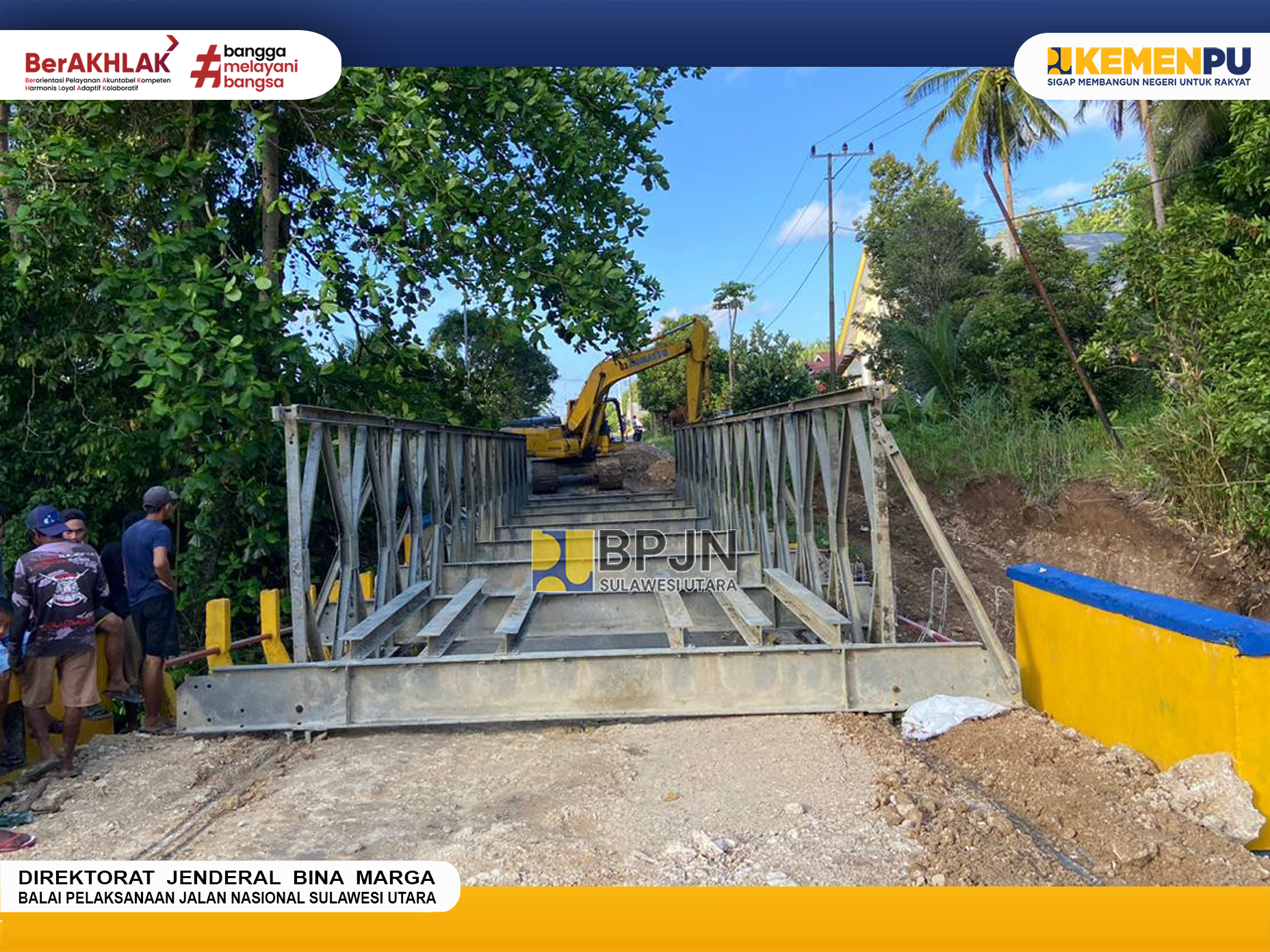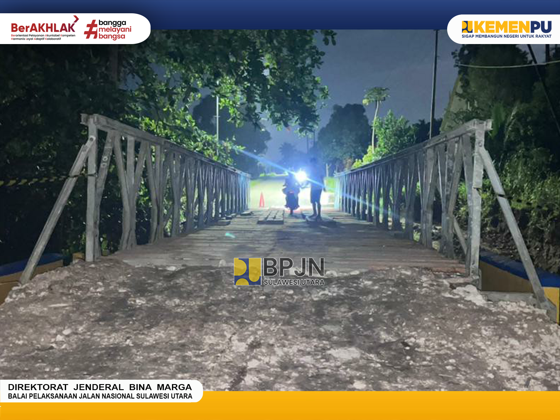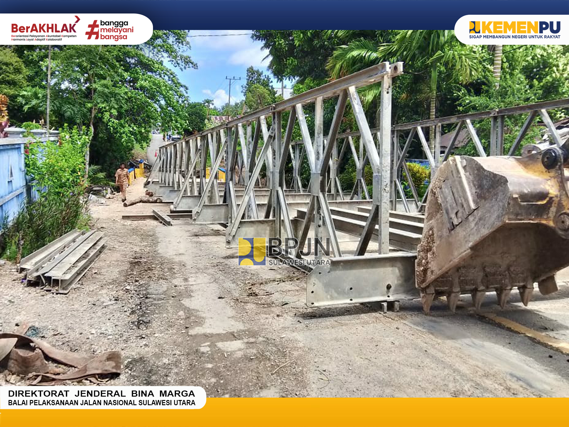 Balai Pelaksanaan Jalan Nasional (BPJN) Sulawesi Utara Melalui Satker PJN Wilayah III Prov. SULUT, PPK 3.3 telah melakukan penanganan pada jembatan Andaaran I yang mengalami kerusakan dengan melakukan pemasangan Jembatan Darurat (Bailey).