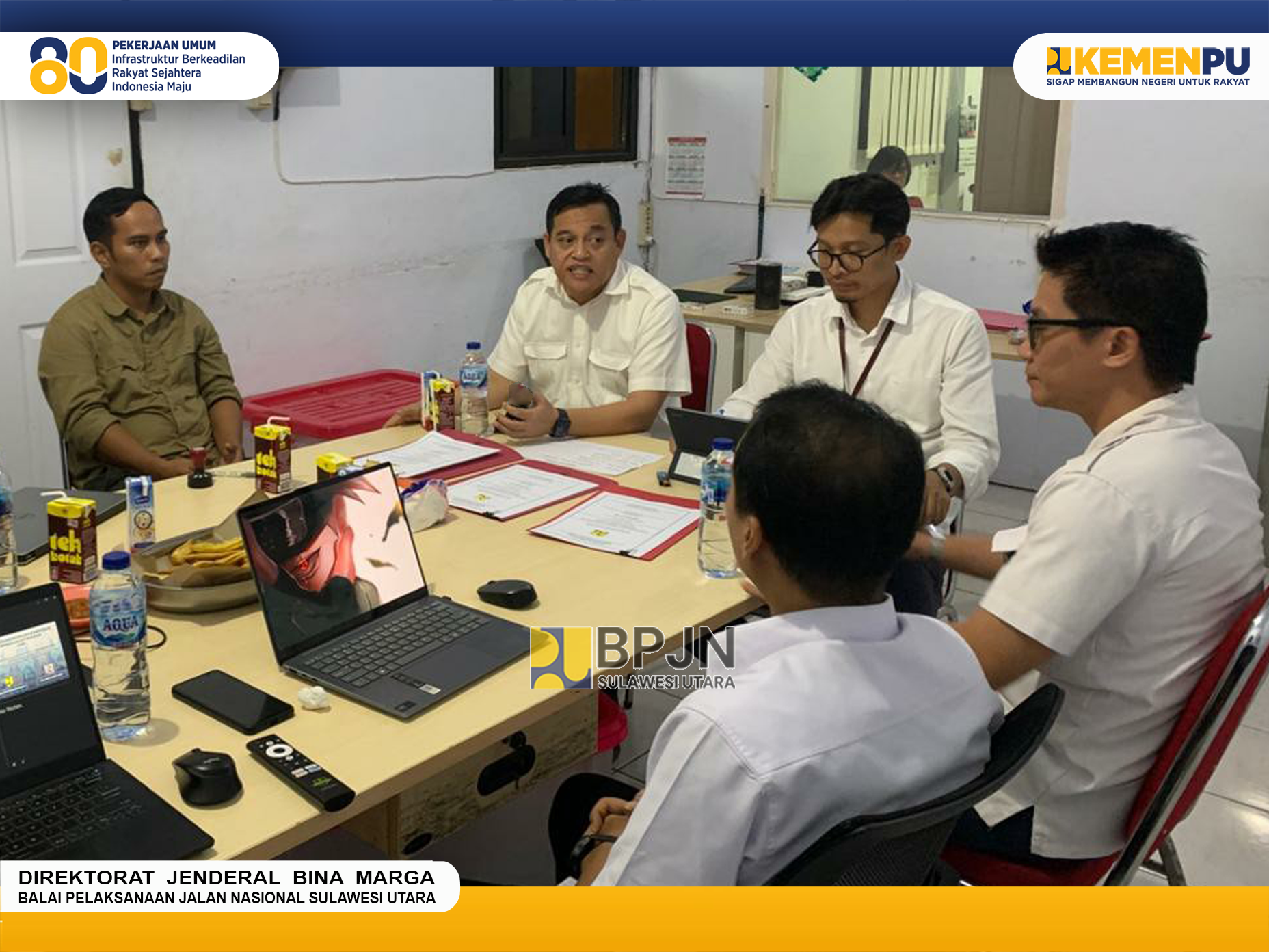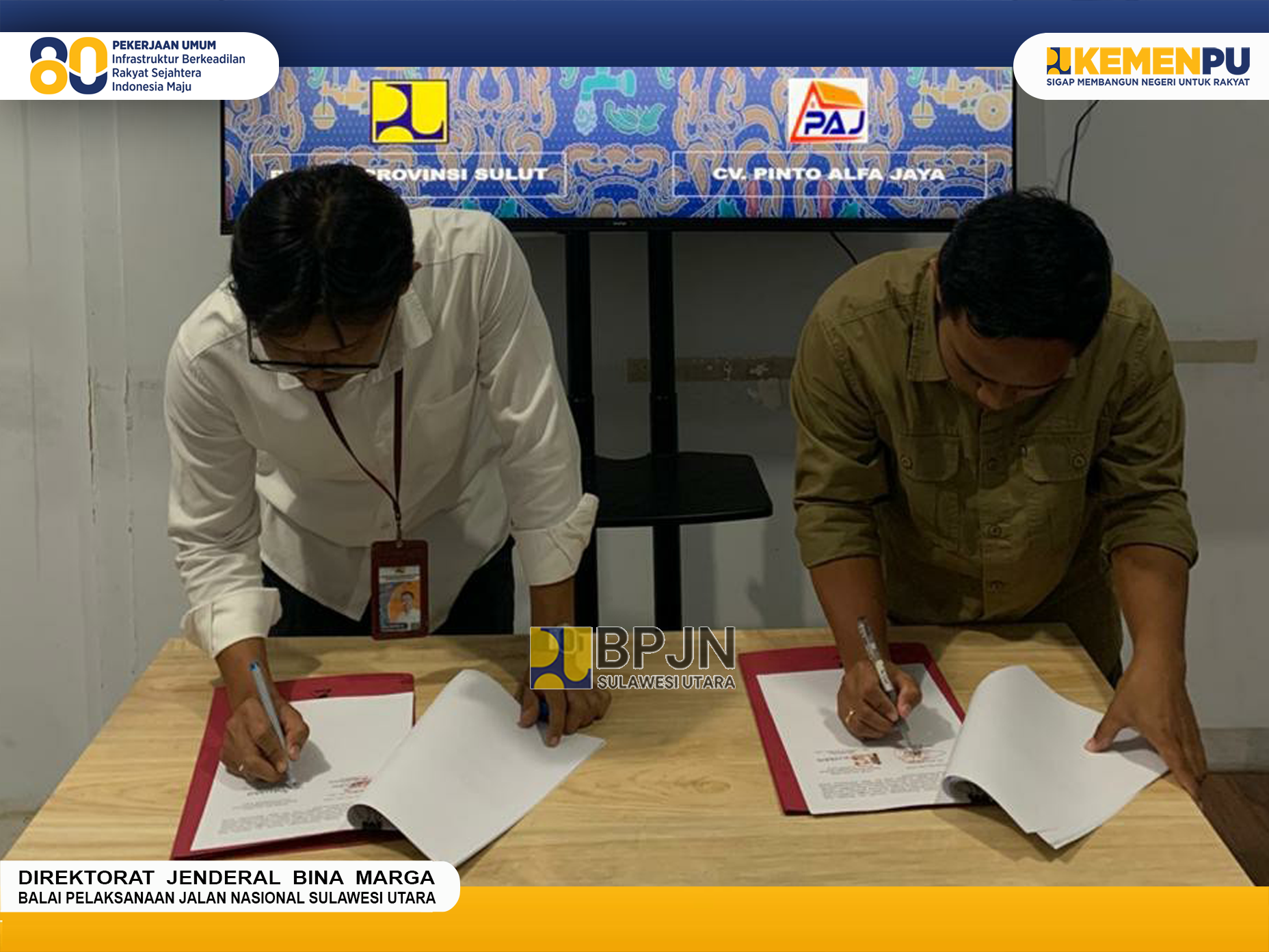 Kegiatan ini dilaksanakan di kantor BPJN Sulut, tepatnya di Ruang Rapat PPK 2.5 Prov Sulut. Penandatanganan ini dilakukan antara Pejabat Pembuat Komitmen (PPK) 2.5 Provinsi Sulawesi Utara dan CV. Pinto Alfa Jaya, sebagai penyedia jasa.