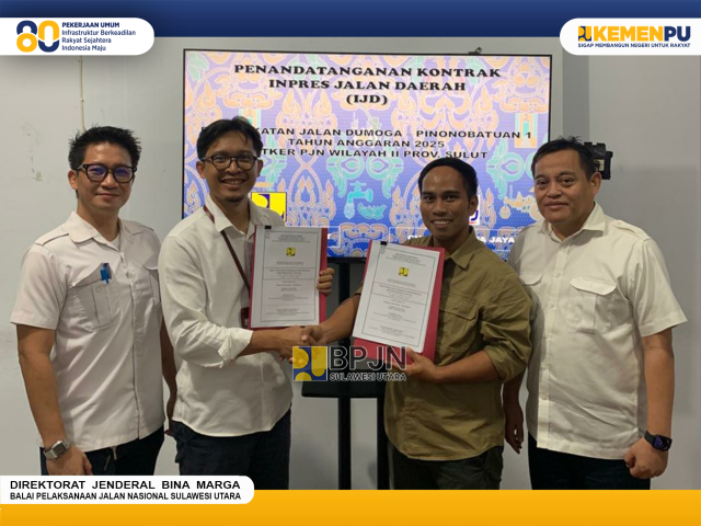 Senin, (24/11/2025). Dalam rangka mendukung program Inpres Jalan Daerah (IJD) Tahap II Tahun 2025, Balai Pelaksanaan Jalan Nasional (BPJN) Sulawesi Utara, Melalui Satker PJN Wilayah II Provinsi Sulawesi Utara, PPK 2.5 melaksanakan penandatanganan kontrak untuk Paket Peningkatan Jalan Dumoga – Pinonobatuan 1 Tahun Anggaran 2025.
