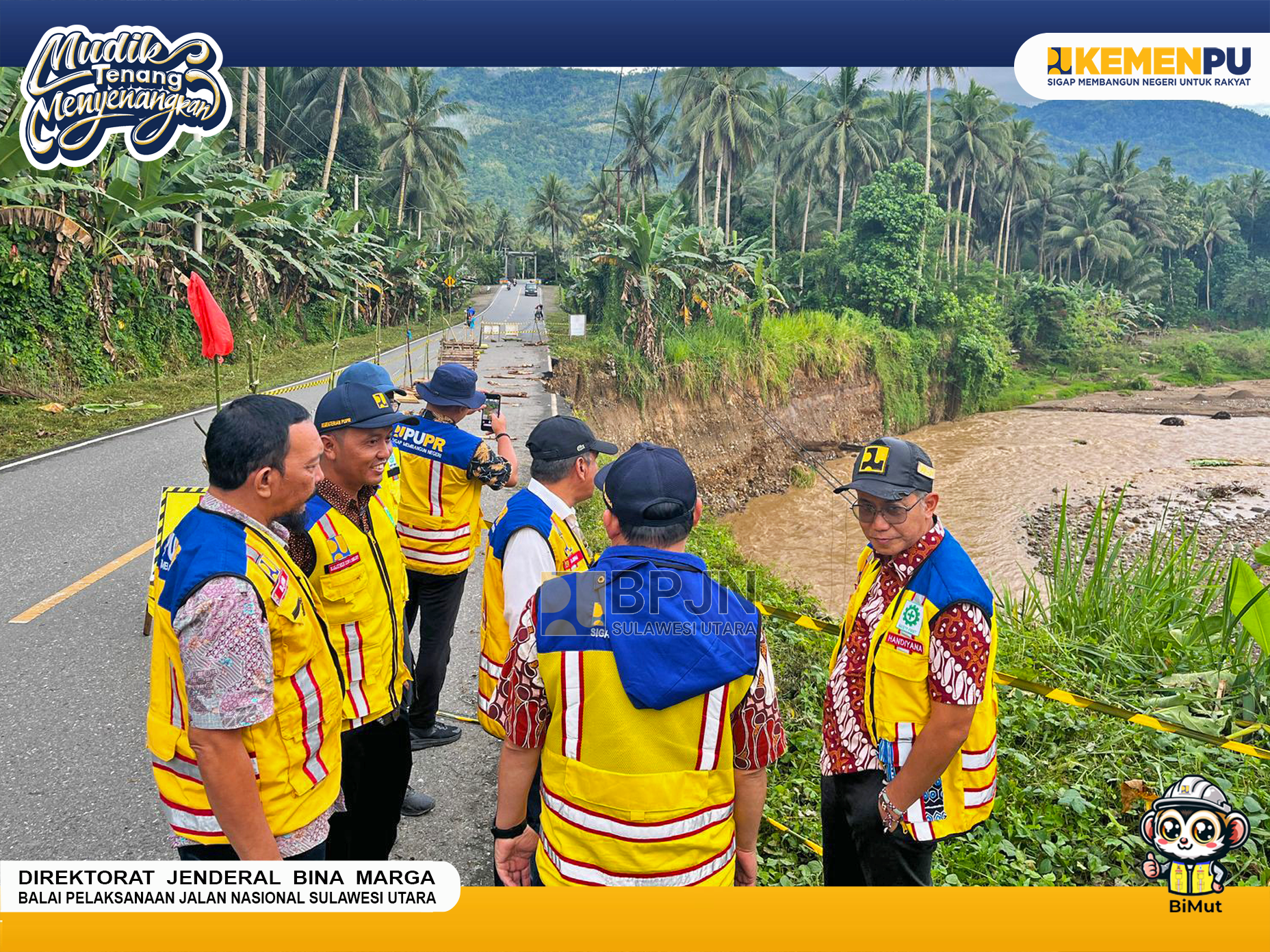 Kepala BPJN Sulawesi Utara Bapak Handiyana, S.T, M.T, M.Sc mendamping Kepala BPIW Bapak Ir. Bob Arthur Lombogia M.Si, Kepala Subdirektorat Perencanaan Teknis Preservasi II Bapak Christoforus Mardjono Tjatur Lasmono, S.T., M.Tech dan Tim Pemantau dalam rangka memastikan kesiapan Jalur Mudik Lebaran di Provinsi Sulawesi Utara