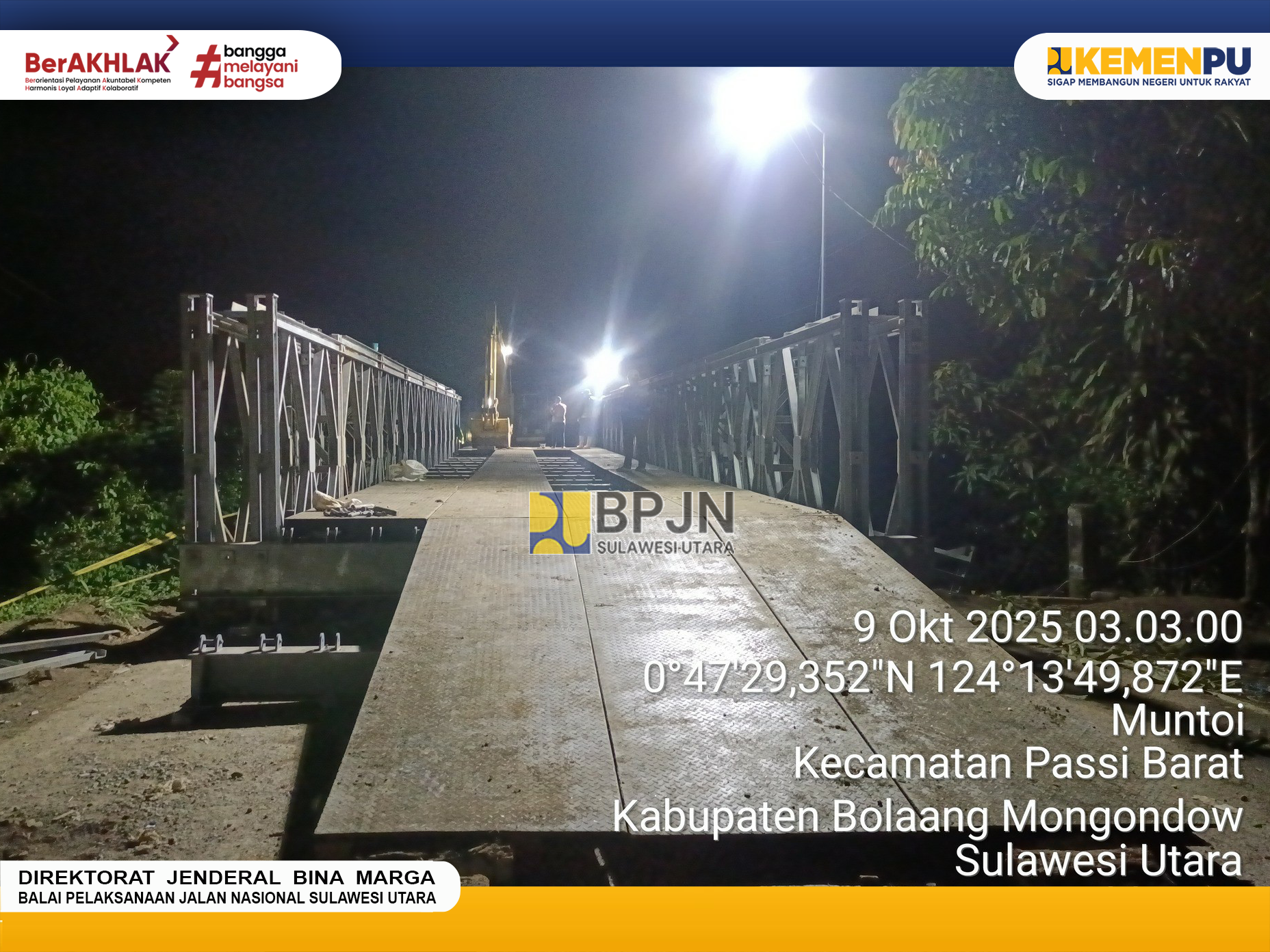 Saat ini jembatan darurat telah dapat dilalui oleh kendaraan dengan sistem buka-tutup satu jalur (contraflow) dan beban maksimal 20 ton. Langkah ini merupakan upaya cepat dari PPK 2.4 Provinsi Sulawesi Utara untuk memulihkan konektivitas dan mendukung mobilitas masyarakat serta distribusi logistik di wilayah tersebut.