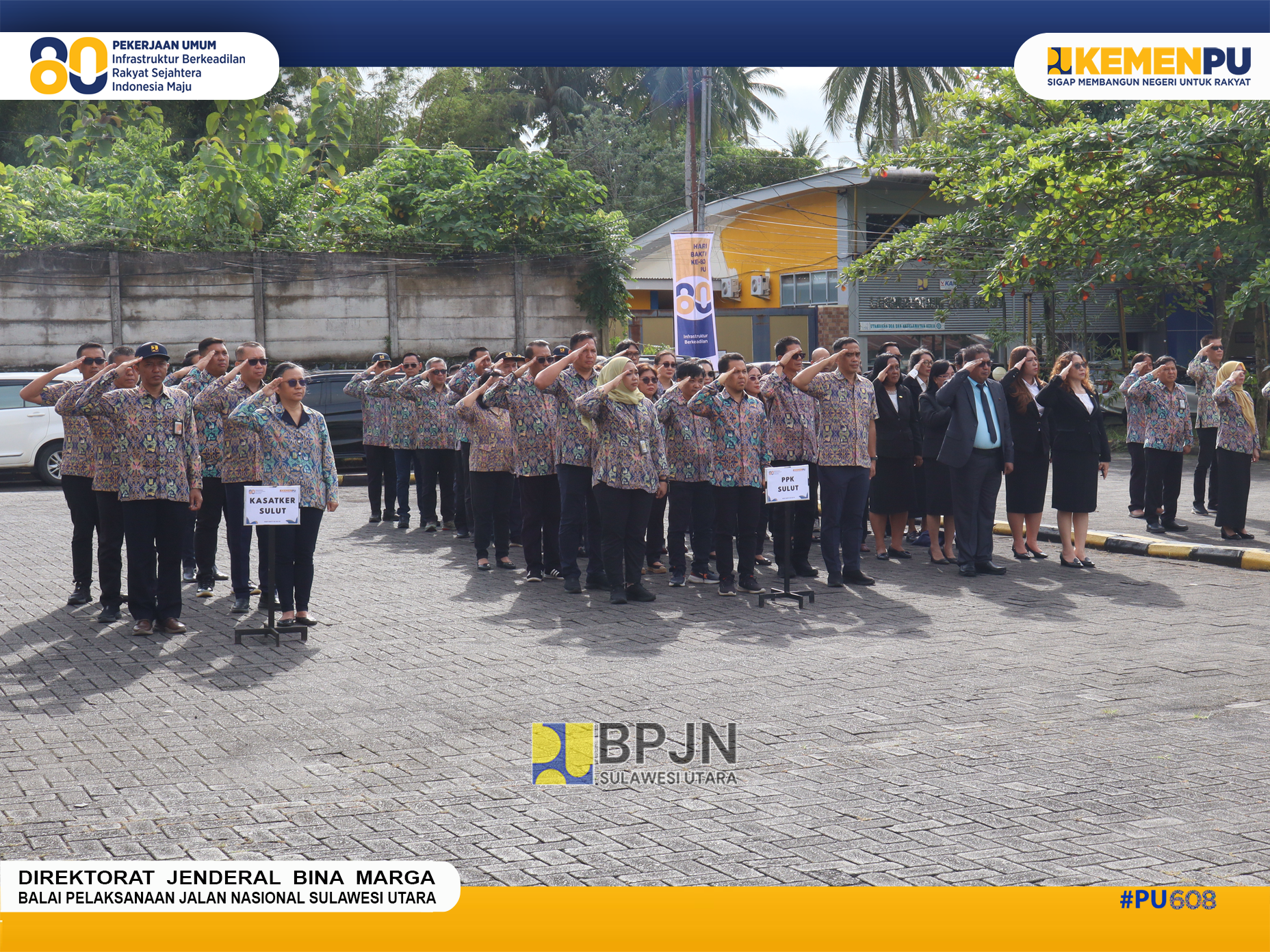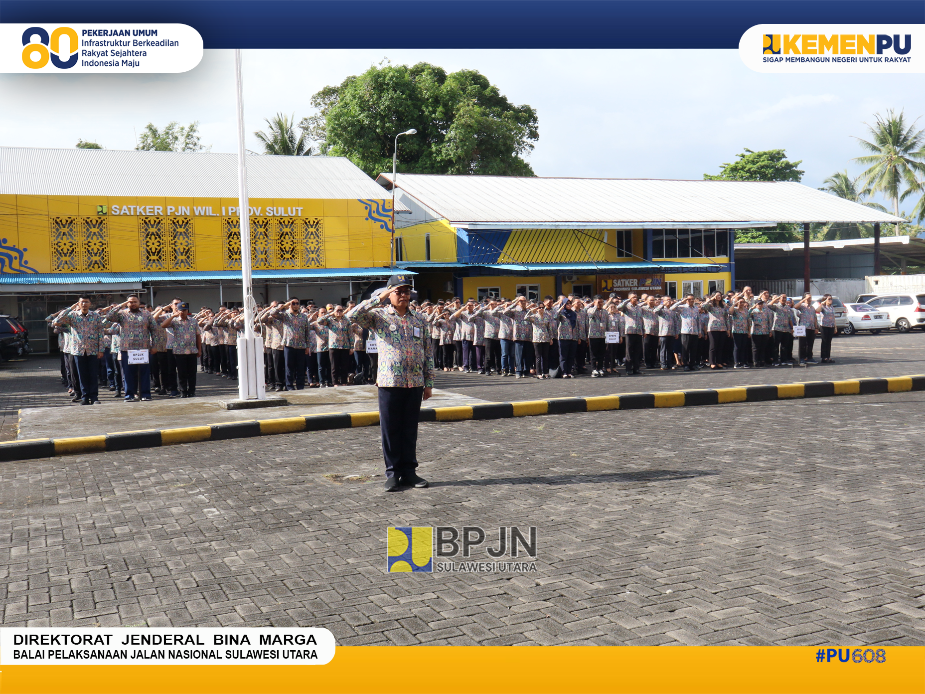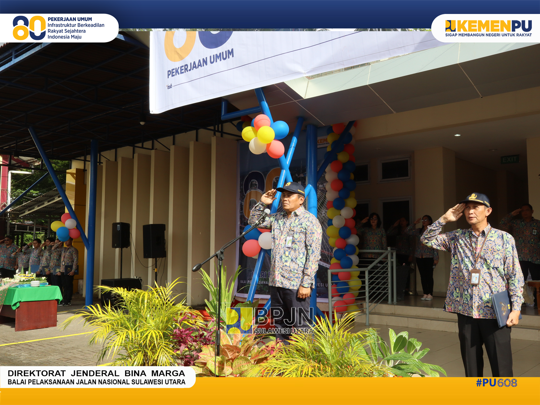 UPT Balai Kementerian Pekerjaan Umum Sulawesi Utara melaksanakan Upacara Bendera dalam rangka memperingati Hari Bakti Pekerjaan Umum Ke-80 pada 3 Desember 2025. Upacara berlangsung khidmat di halaman Kantor Balai Pelaksanaan Jalan Nasional (BPJN) Sulawesi Utara, Rabu (3/12/2025).