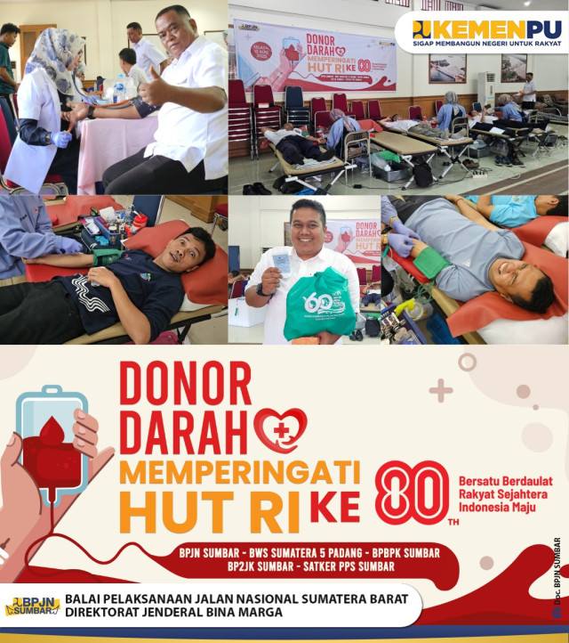 Padang — Dalam rangka memperingati Hari Ulang Tahun ke-80 Republik Indonesia, Balai Pelaksanaan Jalan Nasional (BPJN) Sumatera Barat menggelar kegiatan Donor Darah yang berlangsung di Aula BPJN Sumatera Barat. Kegiatan ini menjadi bagian dari upaya memperkuat semangat kemanusiaan, solidaritas, dan kepedulian sosial di lingkungan instansi pemerintah.