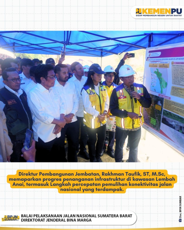 Kunjungan ini bertujuan untuk melihat langsung kondisi infrastruktur pasca banjir serta memastikan capaian penanganan darurat maupun permanen yang telah dan sedang dilaksanakan. Pada kesempatan tersebut, Direktur Pembangunan Jembatan, Rakhman Taufik, ST, M.Sc, memaparkan progres penanganan infrastruktur di kawasan Lembah Anai, termasuk Langkah percepatan pemulihan konektivitas jalan nasional yang terdampak.