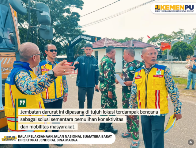 Sinergi antara TNI, Kementerian Pekerjaan Umum (PU), dan pemerintah daerah terus diperkuat dalam upaya percepatan pemulihan akses jalan daerah pascabencana di Provinsi Sumatera Barat. Salah satu langkah konkret yang dilakukan adalah pemasangan Jembatan Bailey yang merupakan aset Kementerian PU.