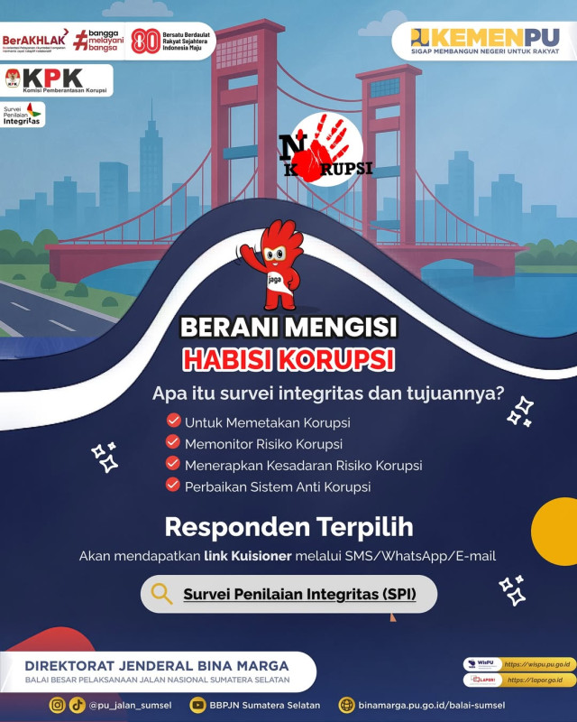 Sehubungan dengan hal tersebut, BBPJN Sumatera Selatan mengajak seluruh pegawai, mitra kerja, serta pengguna layanan yang menerima undangan resmi dari KPK (melalui pesan WhatsApp SPI dengan centang biru ?) untuk berpartisipasi aktif dengan mengisi survei secara jujur, objektif, dan bertanggung jawab. Setiap jawaban yang diberikan menjadi masukan berharga dalam memperkuat sistem pencegahan korupsi.