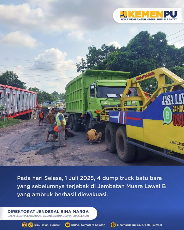 Ucapan terima kasih disampaikan kepada seluruh pihak yang telah berkontribusi dan bekerja sama dalam proses evakuasi serta penanganan pascakejadian. Dukungan dan sinergi semua pihak menjadi kunci dalam menjaga pelayanan infrastruktur tetap berjalan dengan baik.
