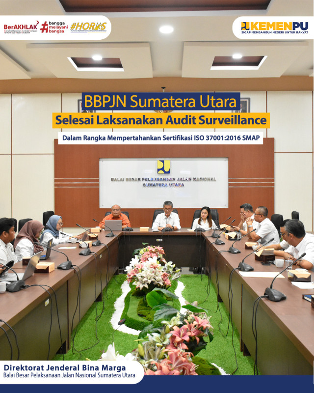 18/09/2025, Medan - BBPJN Sumatera Utara melaksanakan kegiatan Audit Surveillance Sistem Manajemen Anti Penyuapan (SMAP) sebagai bentuk komitmen dalam mewujudkan tata kelola organisasi yang bersih, transparan, dan berintegritas pada 17-18 September 2025.