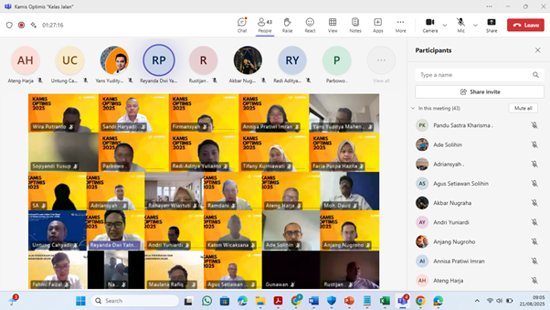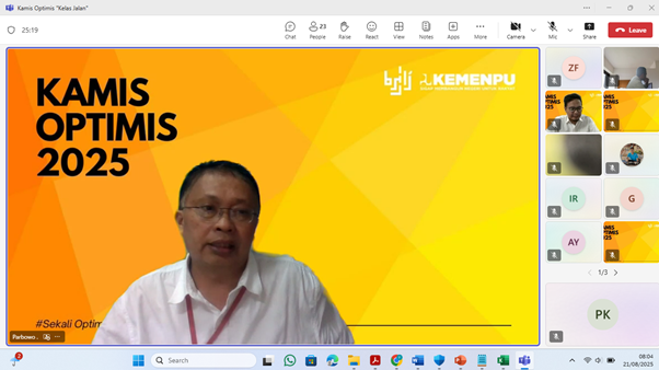 Balai Sistem Jaringan dan Lingkungan Jalan (BSJLJ) kembali menyelenggarakan agenda rutin Kamis Optimis pada Kamis, 21 Agustus 2025. Kegiatan ini dilaksanakan secara daring melalui Microsoft Teams dengan tema “Sistem, Fungsi, Status, dan Kelas Jalan”. Acara ini dipandu oleh Pandu Sastra Kharisma sebagai MC.