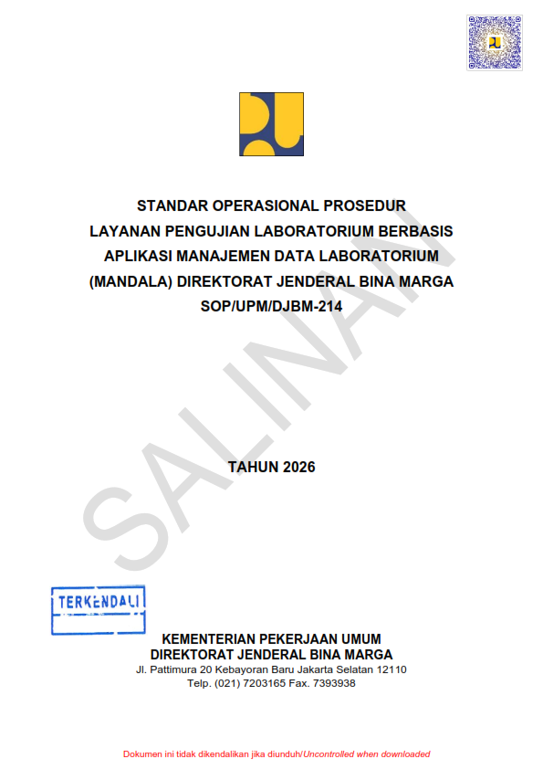 Standar Operasional Prosedur ini mencakup pengaturan layanan pengujian laboratorium melalui aplikasi Manajemen Data Laboratorium (MANDALA) Direktorat Jenderal Bina Marga, mulai dari permohonan layanan pengujian, penjadwalan pengujian, penerimaan sampel, pelaksanaan pengujian hingga penerbitan laporan hasil pengujian. 2026-03-31 16:33:33 |